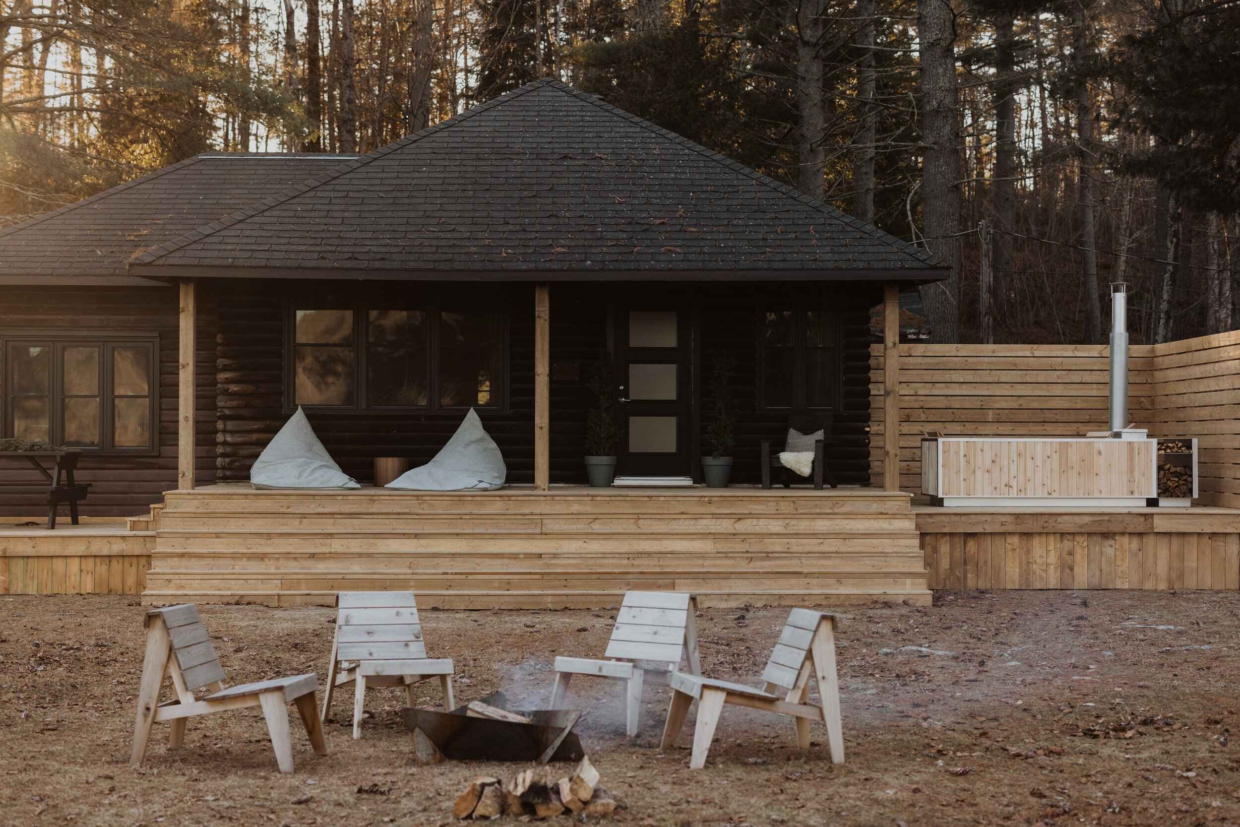 Wooden cabins tucked among the trees.